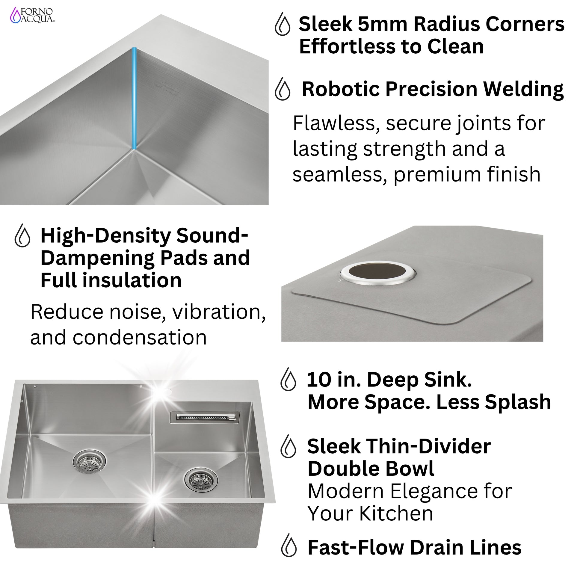 FORNO ACQUA 33 in. Drop-In/Undermount 40/60 Double Bowl Sink with Retractable Faucet & Waterfall