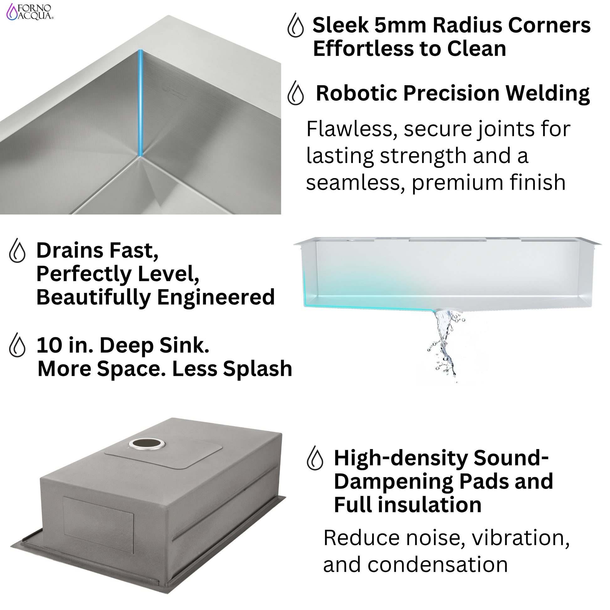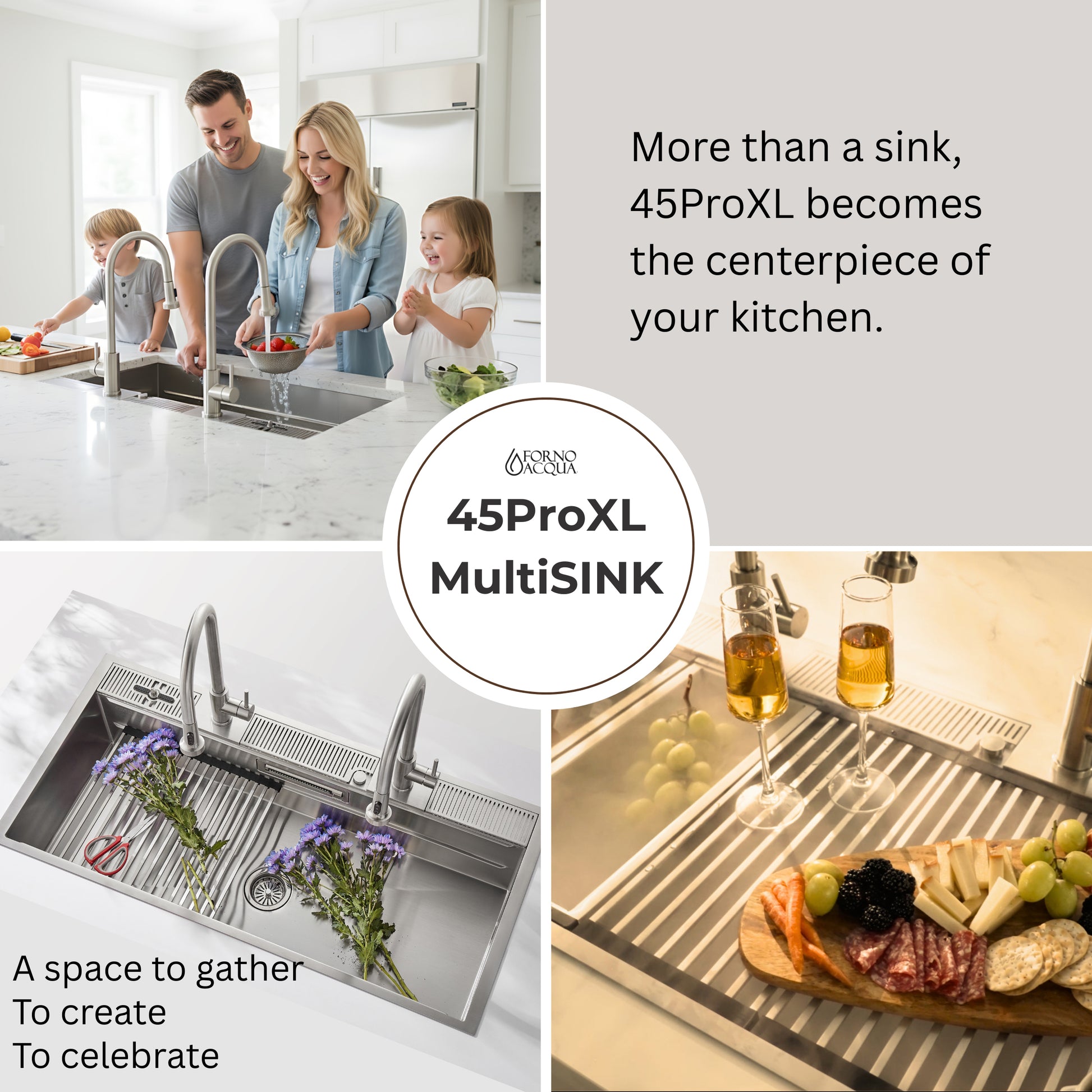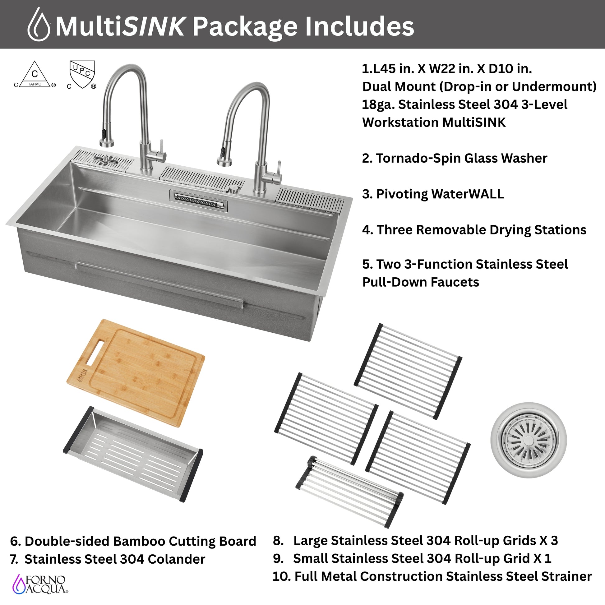 FORNO ACQUA 45 in. Drop-In/Undermount 3-Level Workstation Sink with Two Faucets & Glass Rinser