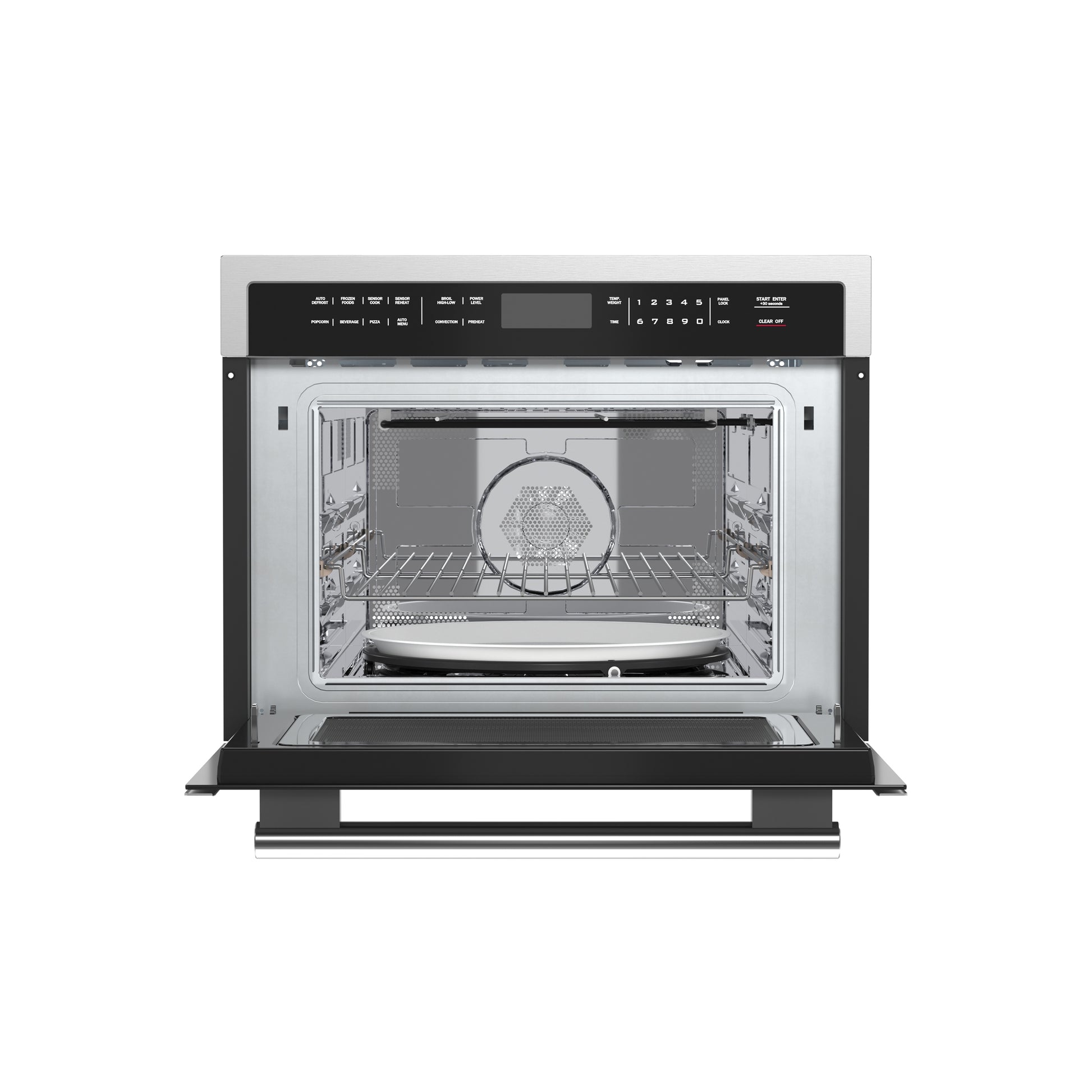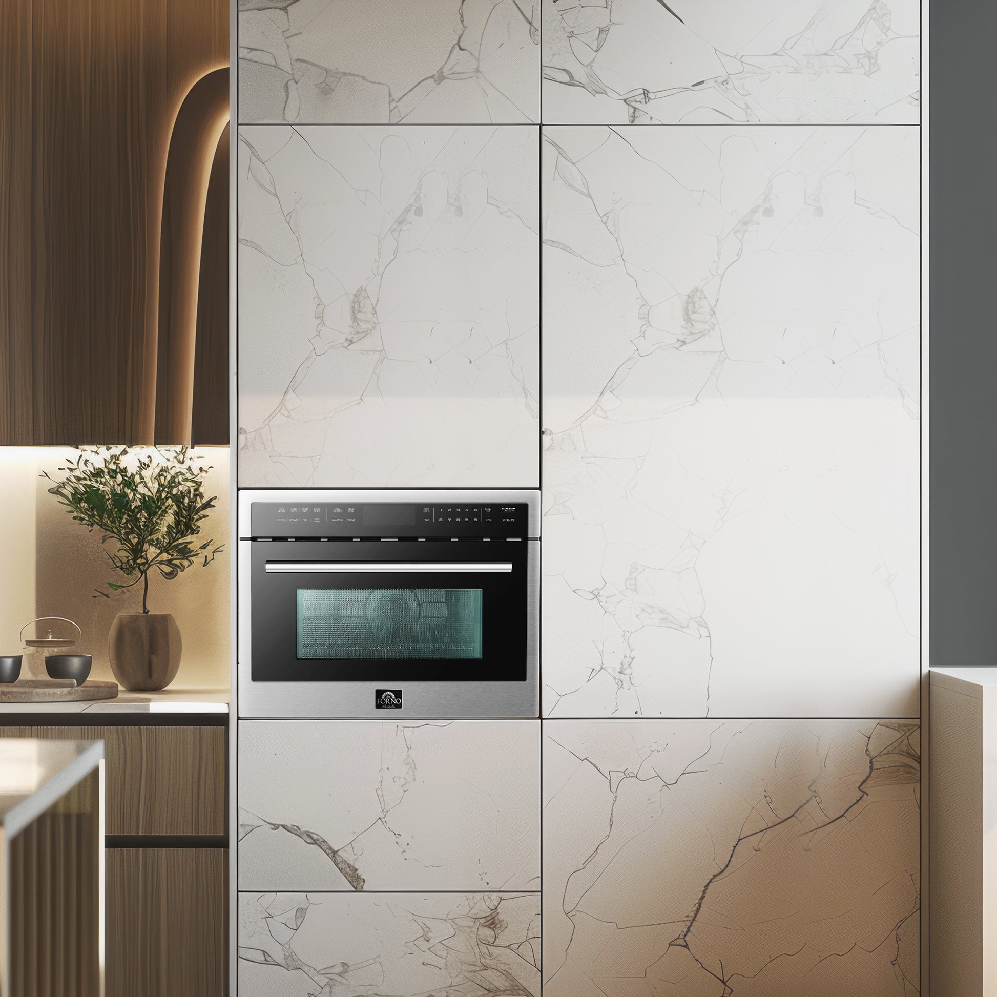 The Forno Oliena 24" Microwave & Convection Oven combines sleek design with versatile functionality, making it an essential addition to any modern kitchen. Its durable stainless-steel interior ensures easy cleaning, while intuitive glass touch controls and an LCD display provide effortless navigation. With 1,000 watts of microwave power, it heats food quickly, boiling water in just 1 minute and 50 seconds. Switch to convection mode for even cooking with 1,700 watts of true convection, or utilize the 1,750-watt broil and 600-watt bake functions for perfectly cooked meals without using your main oven. Sensor cooking, auto menu options, and specialized modes like defrost, popcorn, and beverage heating enhance convenience. The rapid preheat feature minimizes wait times, so your dishes are ready faster. Designed for performance and efficiency, this combination microwave oven elevates your cooking experience with precision and speed.